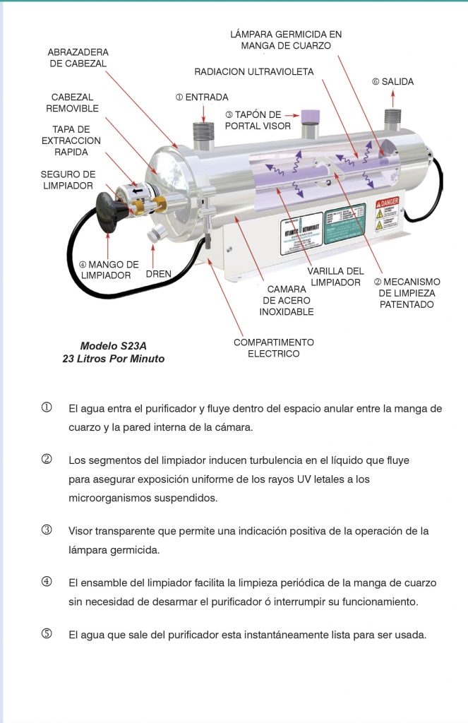 Los Purificadores Ultravioleta utilizan lámparas germicidas ultravioleta que producen radiación de onda corta letal para bacterias, virus y otros microorganismos presentes en el agua.